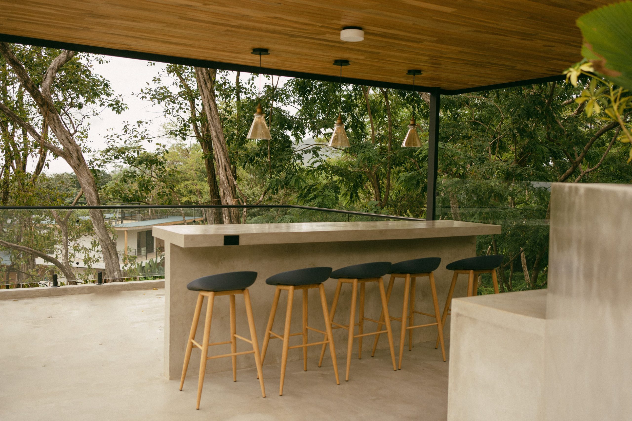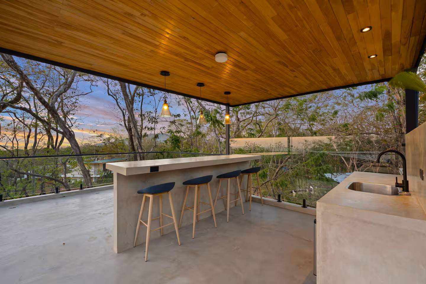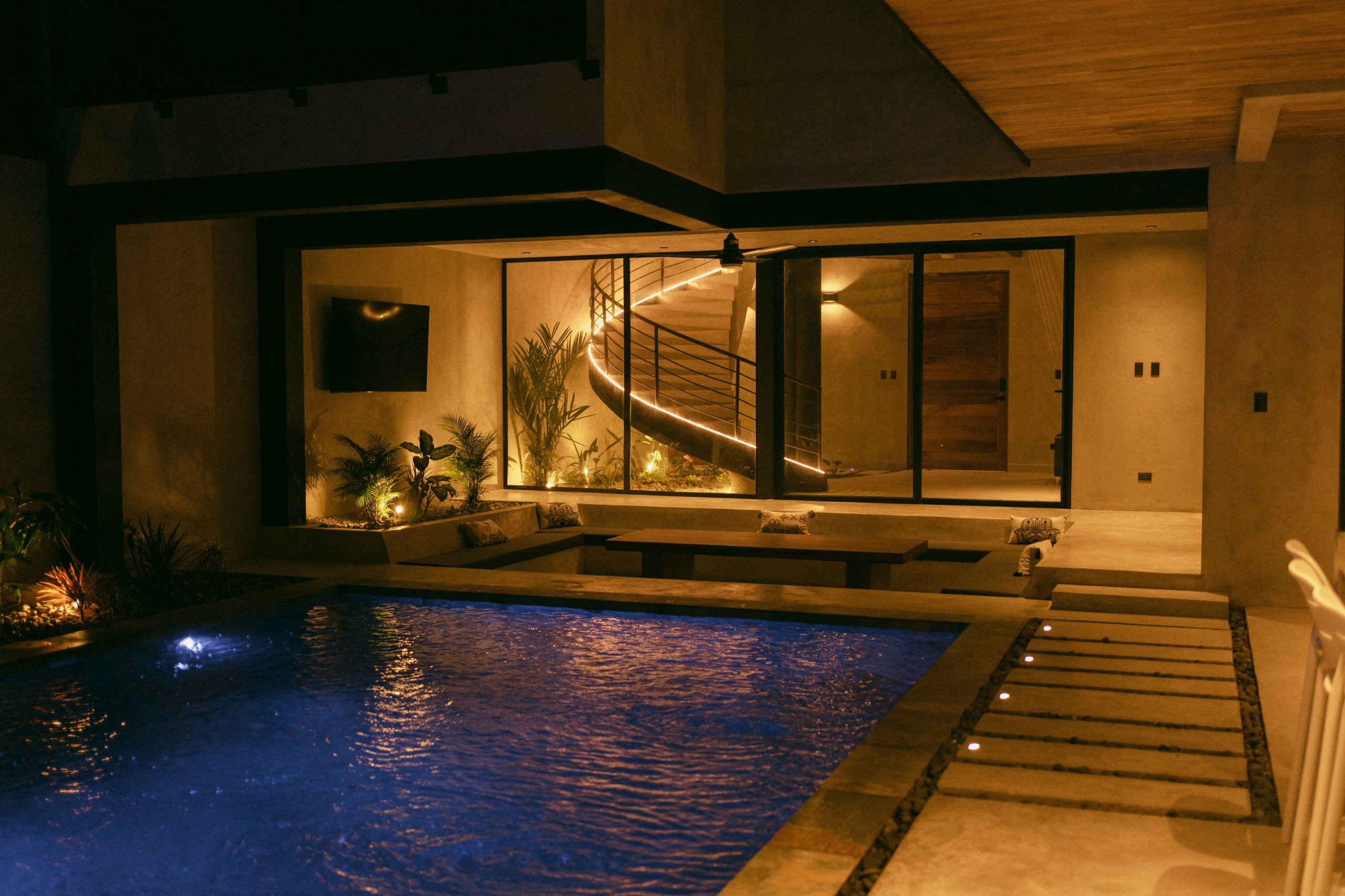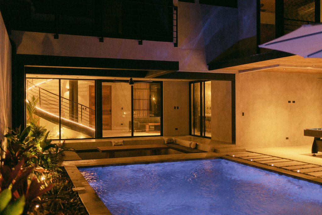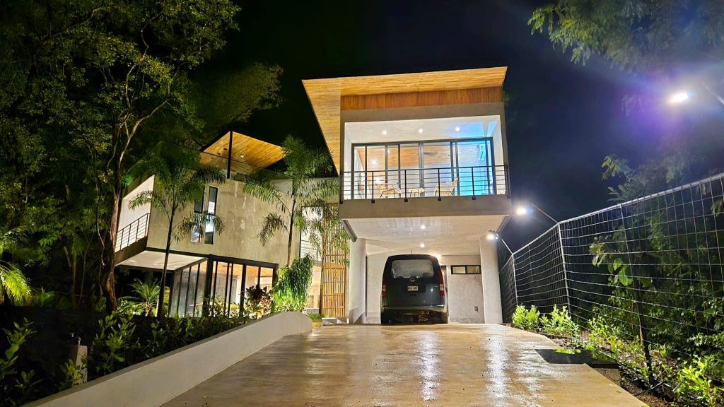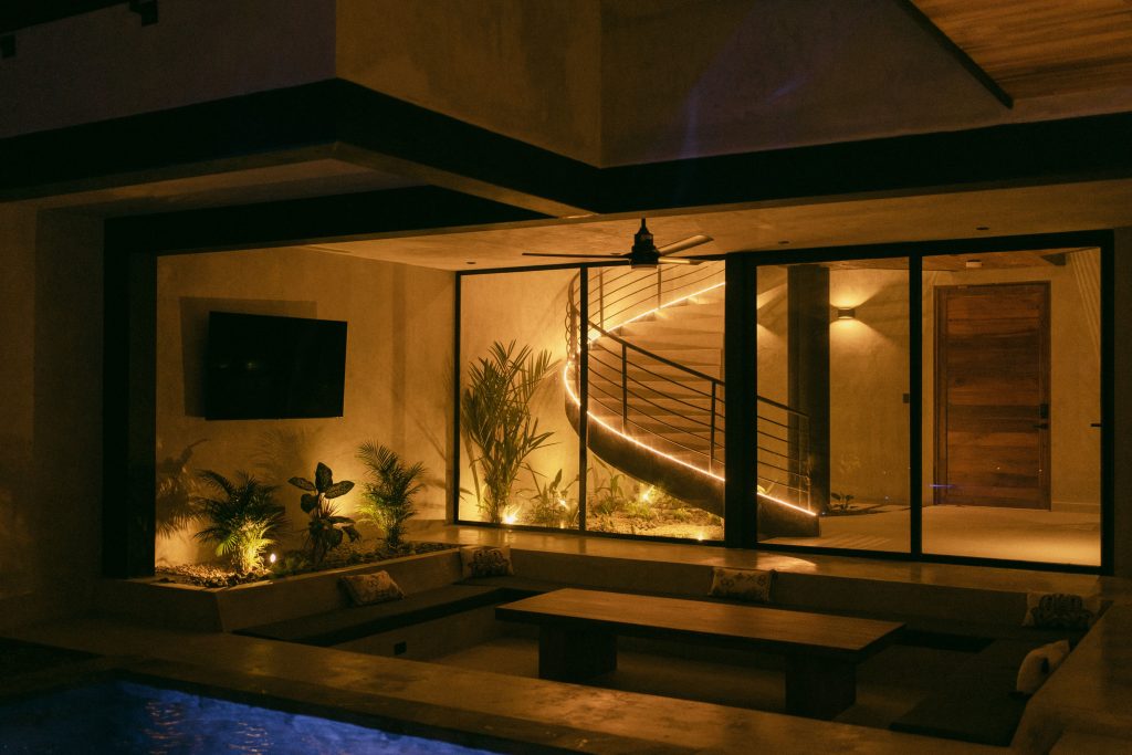 The villa’s exterior blends luxury with natural beauty. Surrounded by lush jungle and open skies, the home features tropical landscaping, natural stone walls, ambient lighting, and spacious outdoor lounging areas. Every detail is designed to create a serene, upscale environment that connects you with the beauty of Playa Grande.