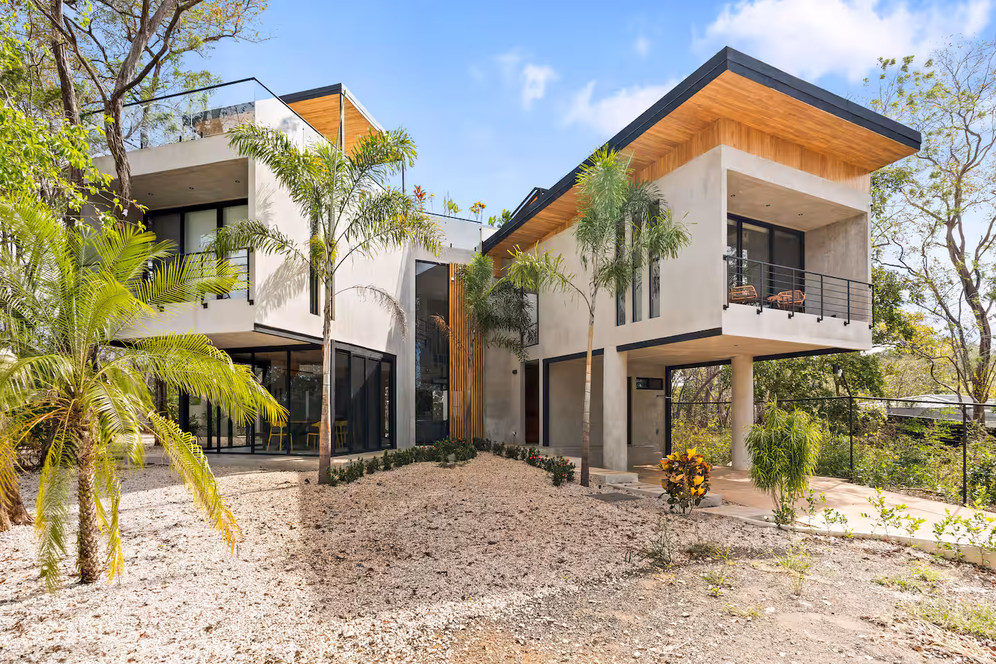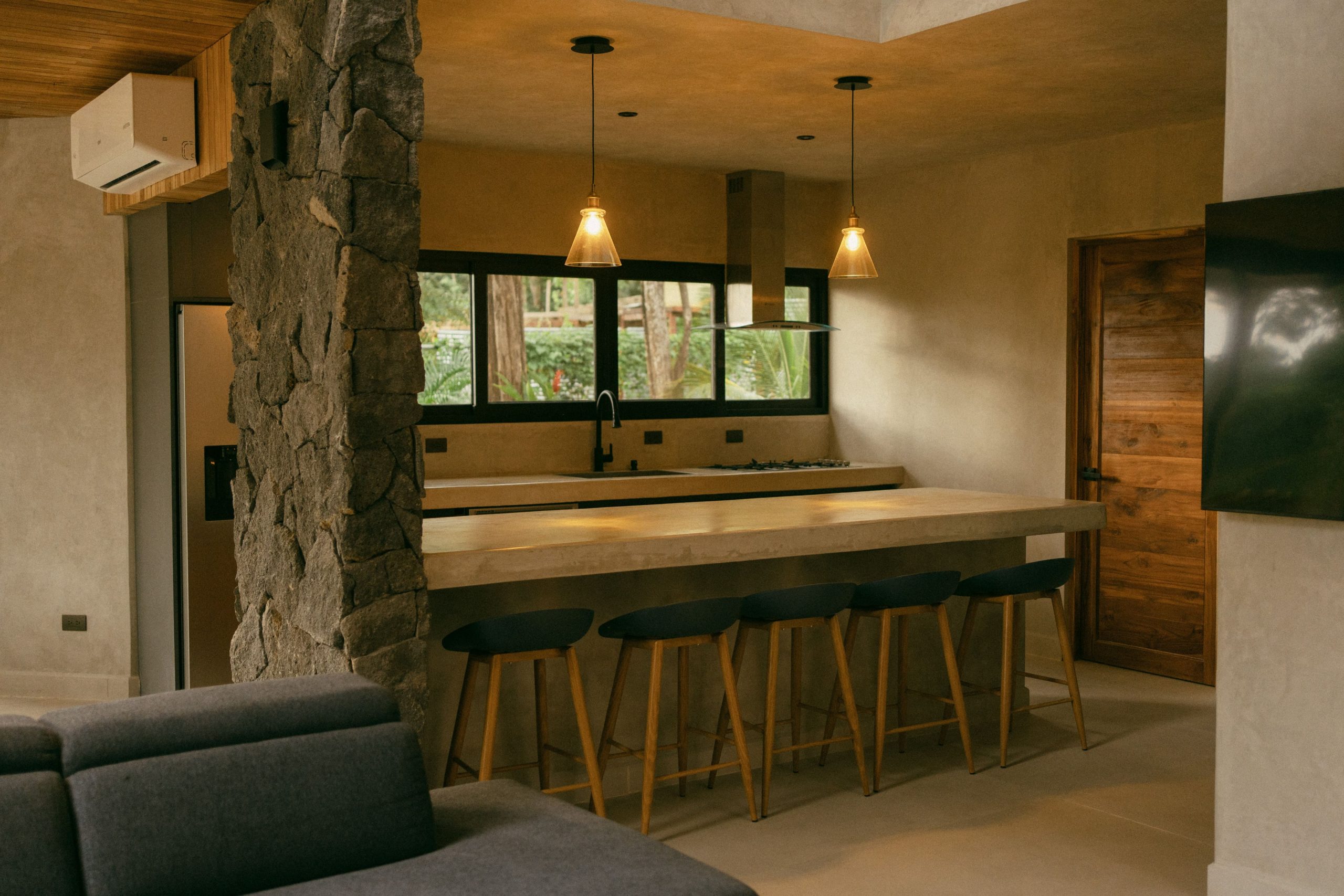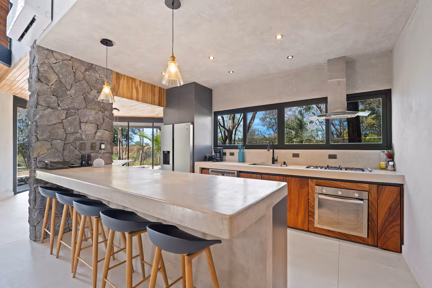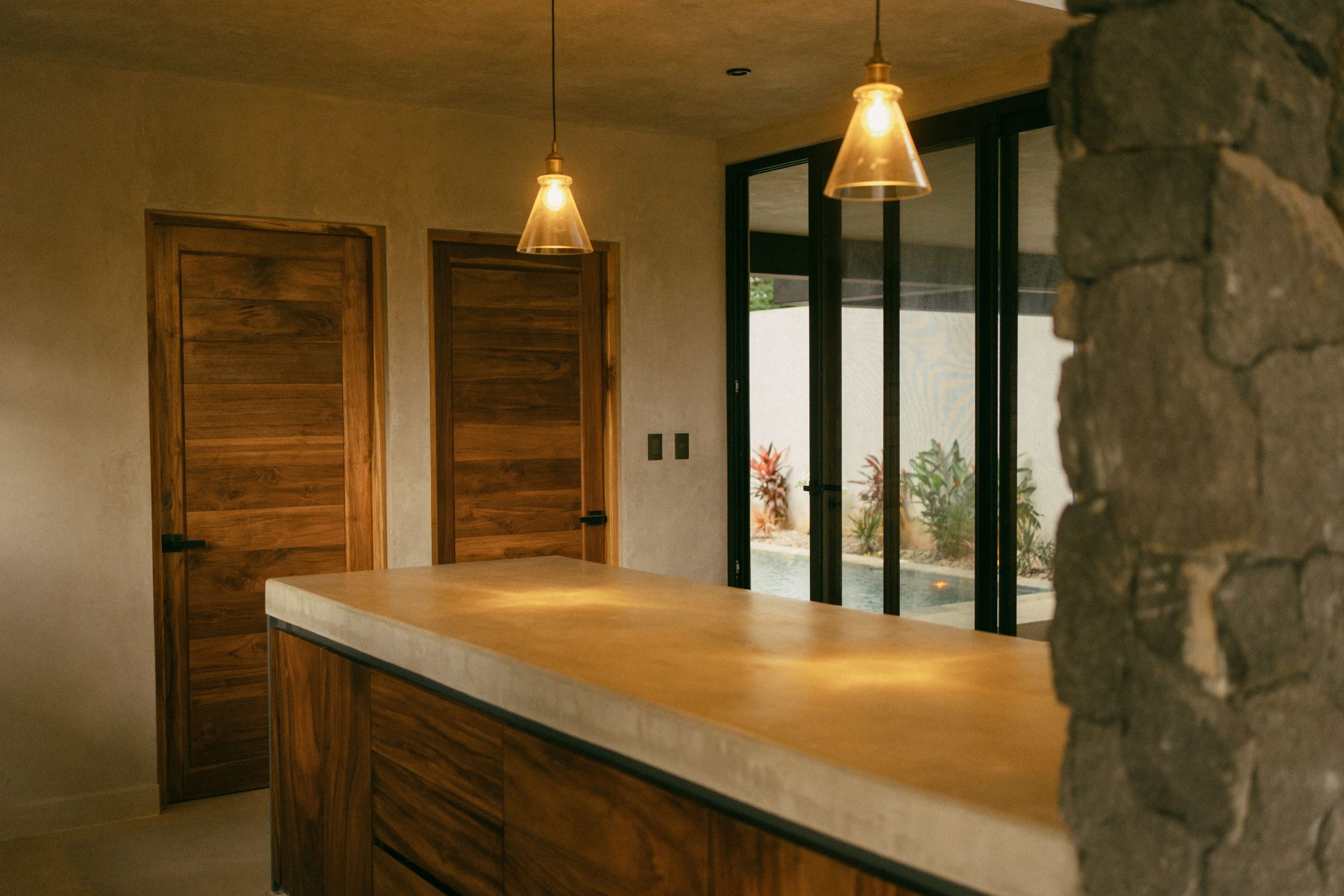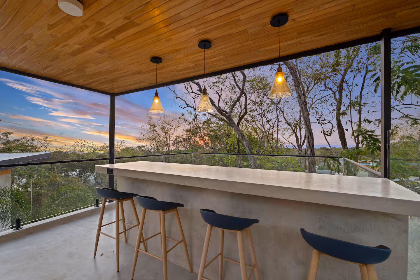 The villa’s exterior blends luxury with natural beauty. Surrounded by lush jungle and open skies, the home features tropical landscaping, natural stone walls, ambient lighting, and spacious outdoor lounging areas. Every detail is designed to create a serene, upscale environment that connects you with the beauty of Playa Grande.