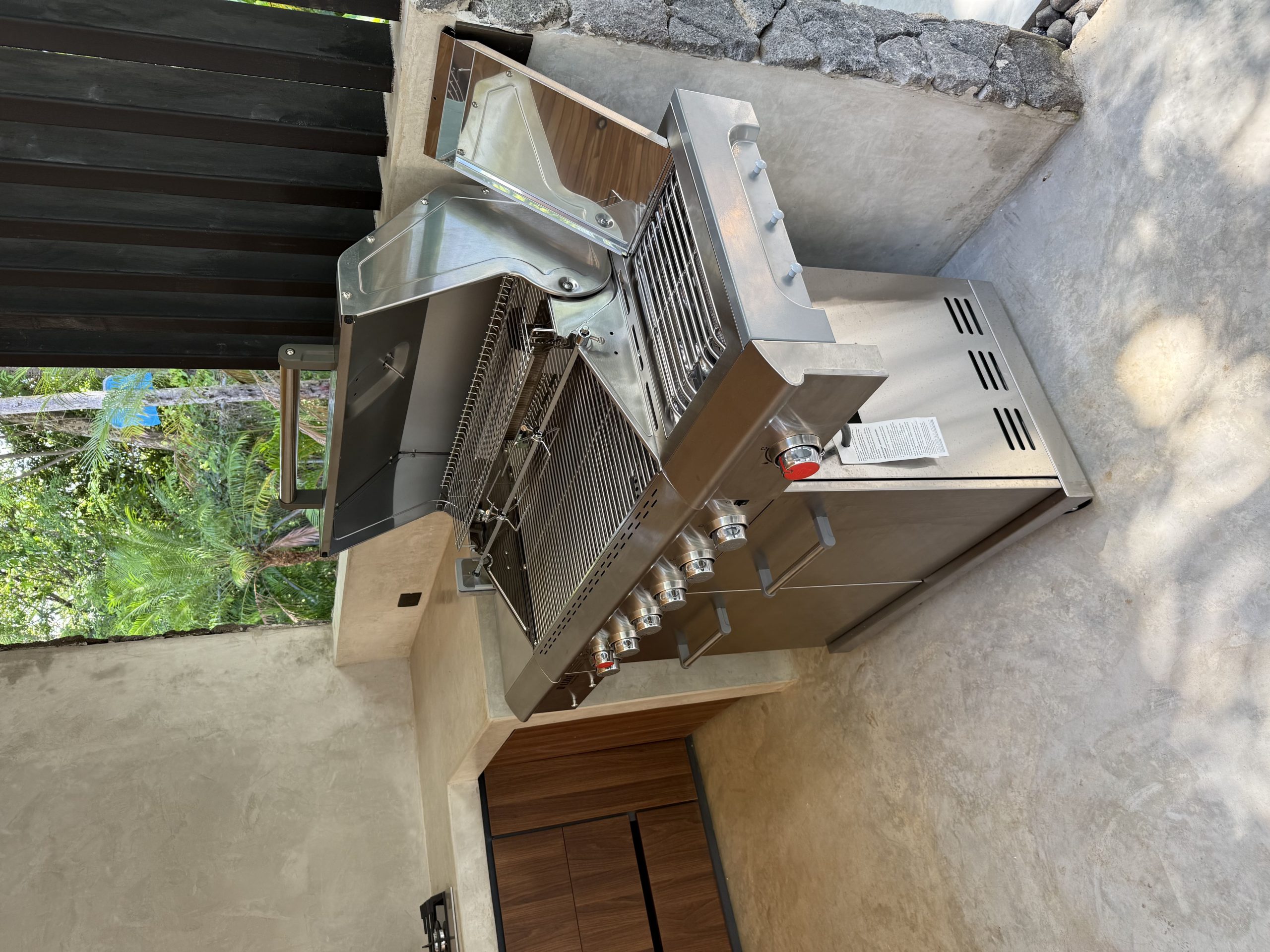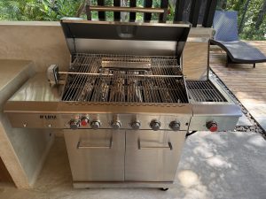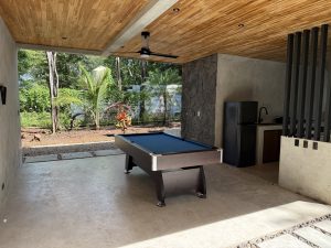 The luxurious pool features lounging chairs both on the Baja step and on the deck, offering a view straight into the protected jungle. Nearby, there’s a shaded hangout area with seating for 12 people, complete with a table and TV. Adjacent to the pool is an outdoor kitchen with a full sized barbecue with a rotisserie spinner, perfect for making poolside meals and keeping the mess outside. Behind the outdoor kitchen you’ll find a restroom and shower. For those who enjoy a game of billiards, there’s an outdoor pool table as well.