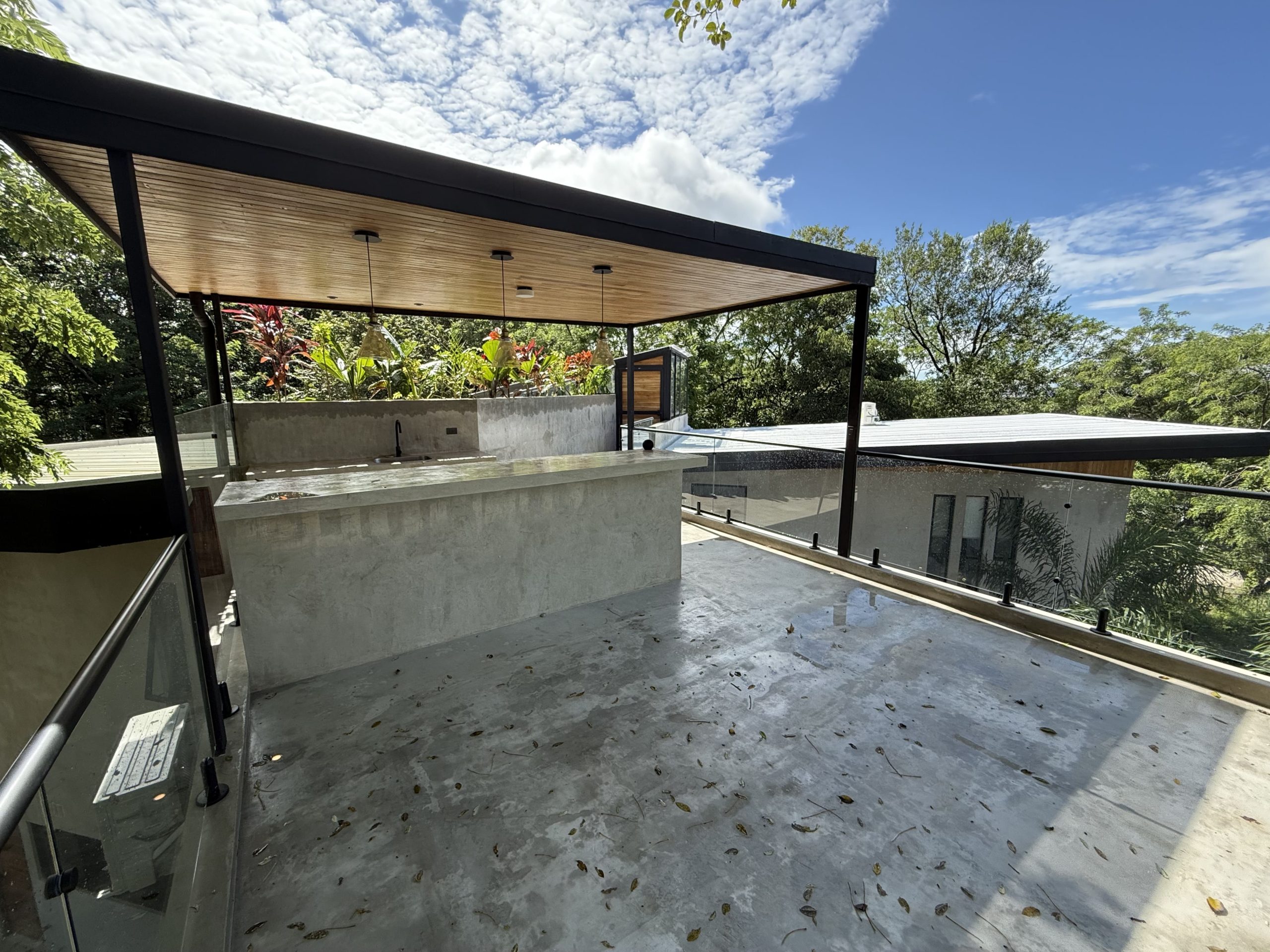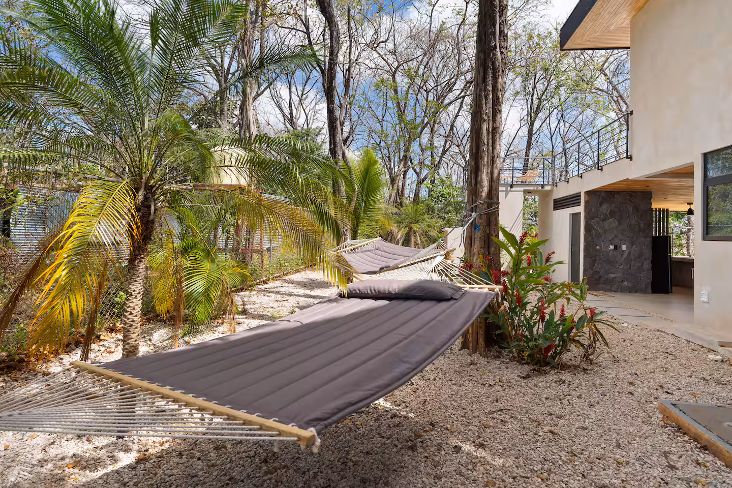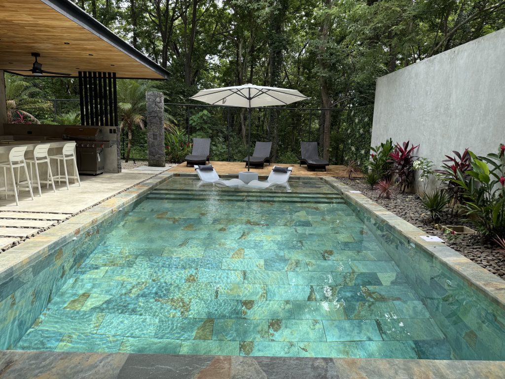 The backyard is a private outdoor oasis perfect for relaxation and entertaining. With lush landscaping, comfortable seating, and a shaded lounge area, it invites you to enjoy Costa Rica’s tropical climate. Whether soaking up the sun or dining alfresco, this space enhances your villa experience beautifully.