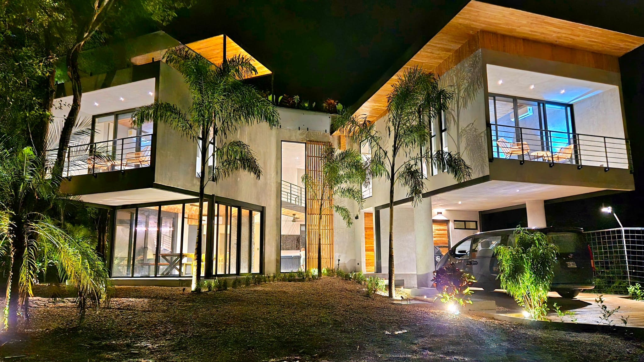 The villa’s exterior blends luxury with natural beauty. Surrounded by lush jungle and open skies, the home features tropical landscaping, natural stone walls, ambient lighting, and spacious outdoor lounging areas. Every detail is designed to create a serene, upscale environment that connects you with the beauty of Playa Grande.
