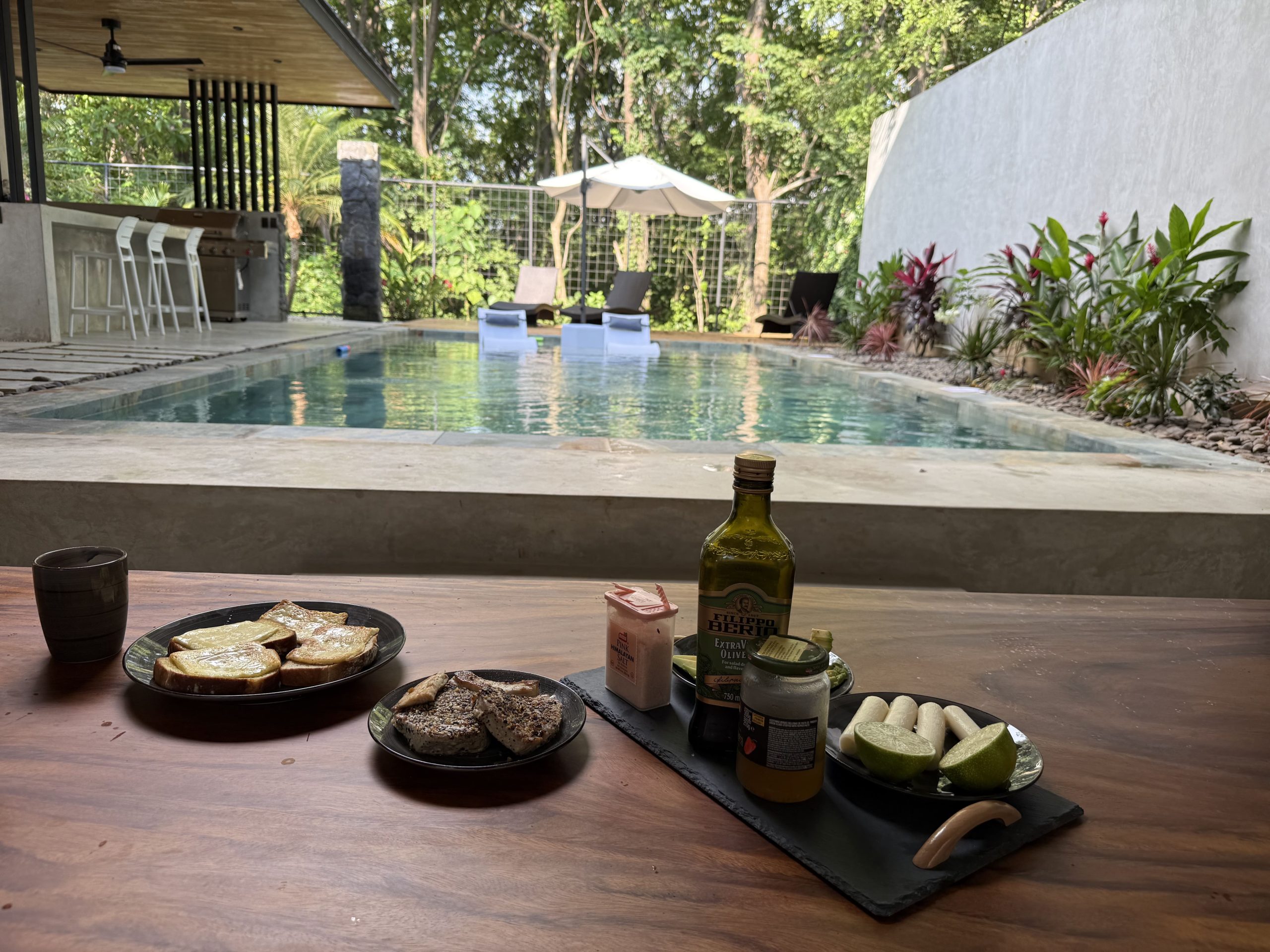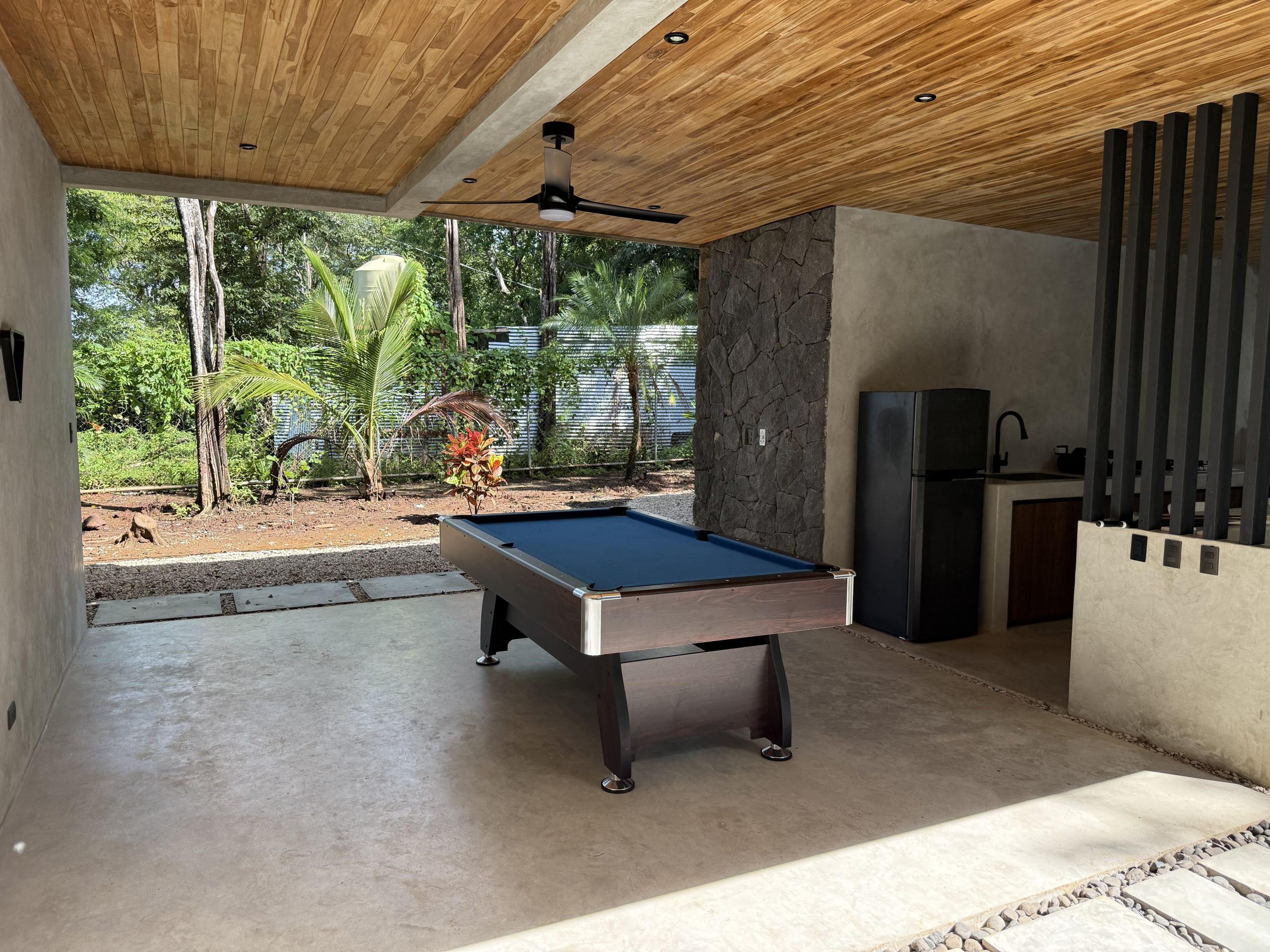 The backyard is a private outdoor oasis perfect for relaxation and entertaining. With lush landscaping, comfortable seating, and a shaded lounge area, it invites you to enjoy Costa Rica’s tropical climate. Whether soaking up the sun or dining alfresco, this space enhances your villa experience beautifully.
